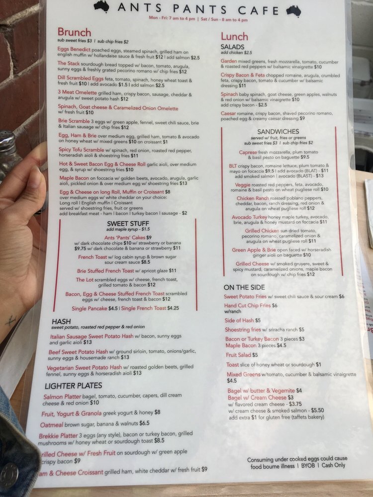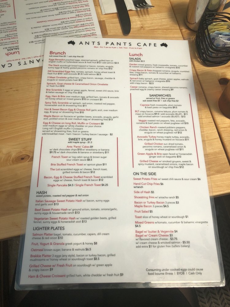 Ants Pants Café located in Philadelphia is a cozy breakfast and brunch spot known for its delicious and unique menu offerings. With options like the 3 Meat Omelette, Ants Pants Pancakes, Avocado Turkey Sandwich, and Buffalo Chicken Caesar Wrap, there's something for every palate. Customers rave about the hot mocha latte and the Whole Lot breakfast combo, which includes eggs, French toast, bacon, and hash browns. The cafe's cash-only policy is worth the visit, as the food is made with love and special attention to detail. The friendly service, rotating specials menu, and BYOB option make Ants Pants Café a must-visit for those looking for a memorable dining experience in the Graduate Hospital area.